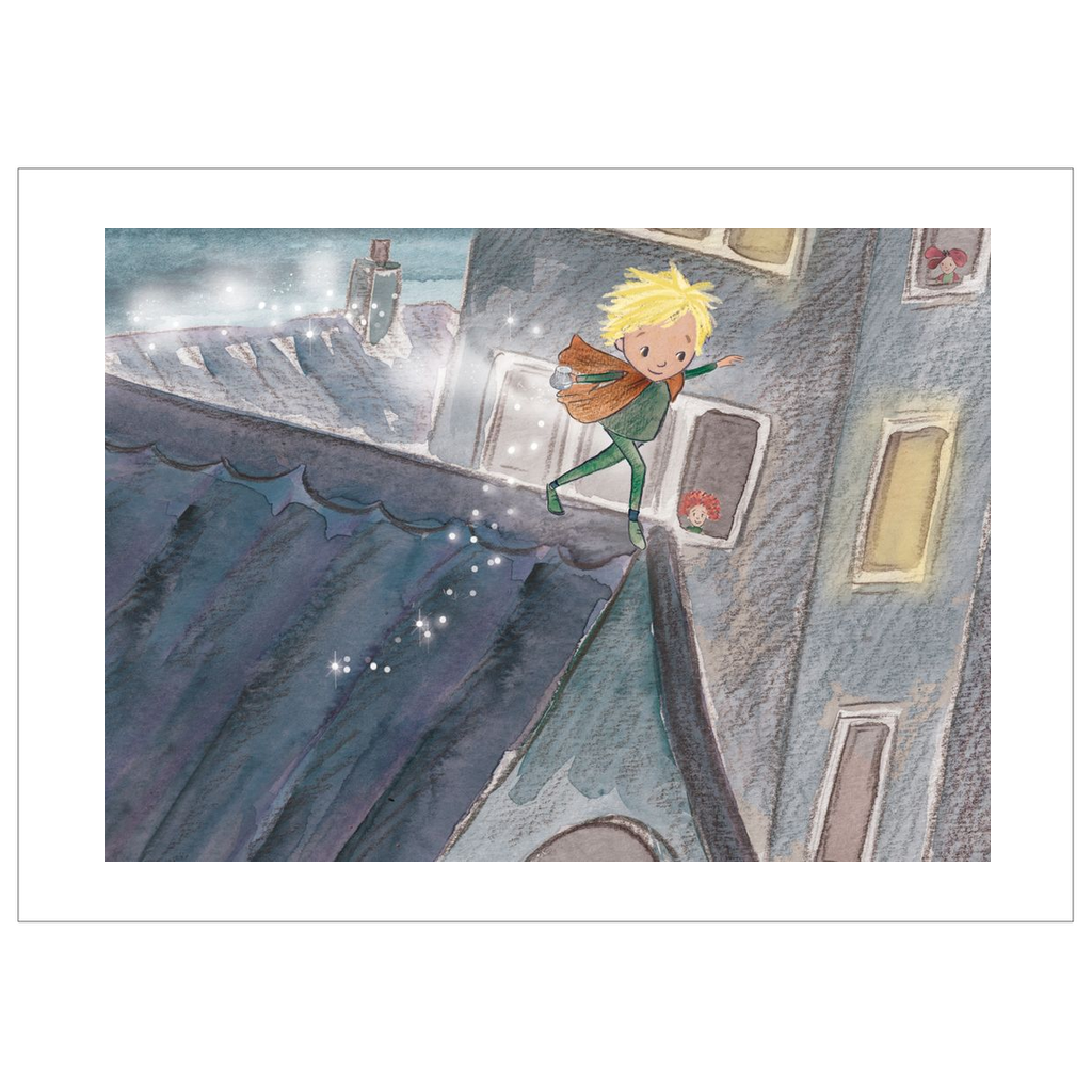 Flat card dandelion boy tiptoes across the rooftops