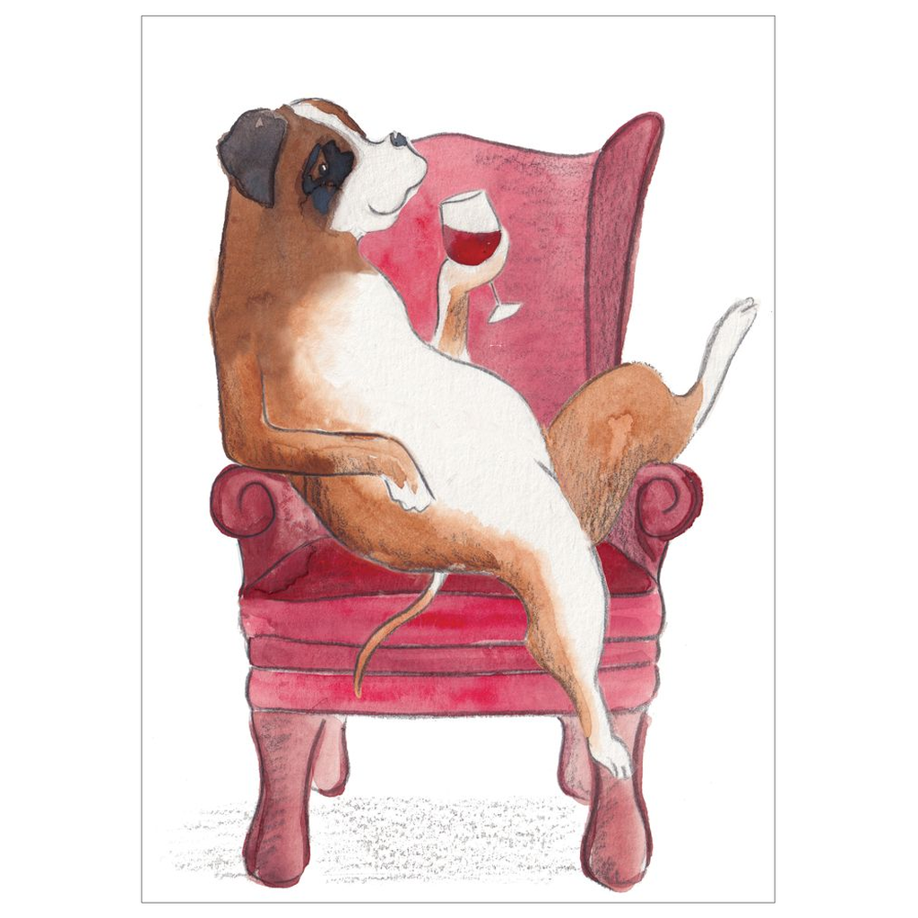 Flat card of boxer enjoying a glass of red wine